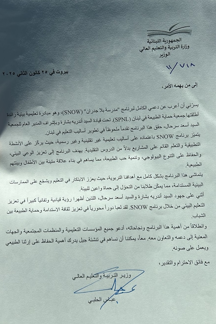 بدوره، سلّم وزير التربية والتعليم العالي القاضي عباس الحلبي رسالة دعم للمشروع، داعيًا جميع المؤسسات التعليمية، والمنظمات المجتمعية، والجهات المعنية إلى دعمه والتعاون معه، بهدف تنشئة جيل يدرك أهمية الحفاظ على إرثنا الطبيعي ويعمل على صونه.